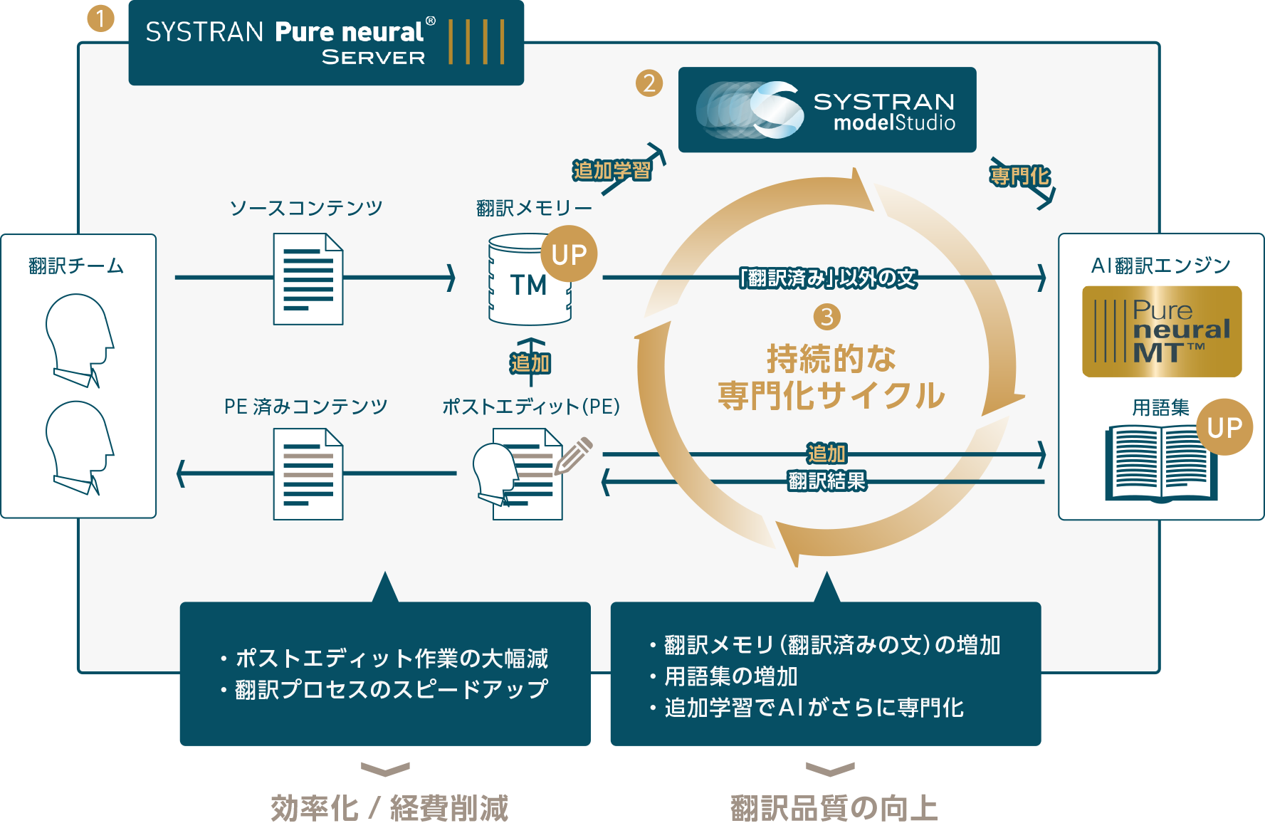 ①を可能にするのは、SYSTRAN Pure NeuralR Server。原文を最初から人手で翻訳するよりも、AIの翻訳結果を少しポストエディット(手直し)することで、翻訳プロセス全体をスピードアップ。同時に翻訳知識として用語集や翻訳メモリに保存することで、翻訳済みの文を再度翻訳する必要がなくなり、翻訳プロセスがさらにスピードアップします。